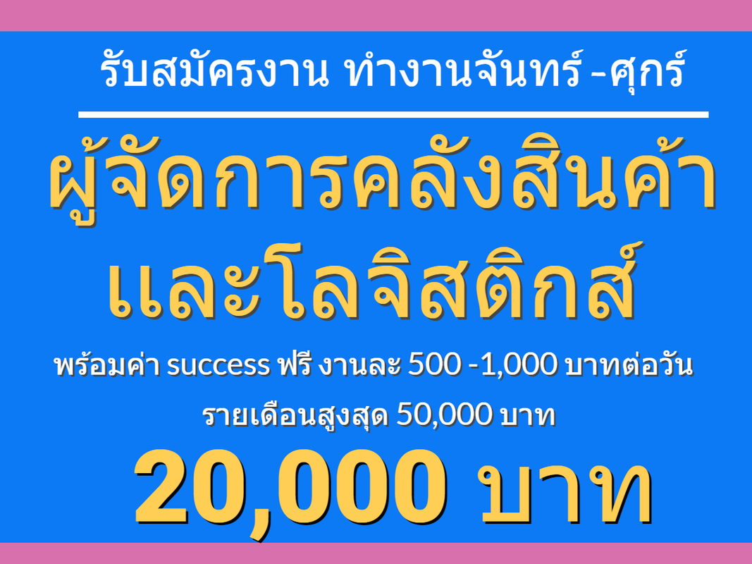 รับสมัคร ผู้จัดการคลังสินค้าเเละโลจิสติกส์ เงินเดือน 20,000 บาท