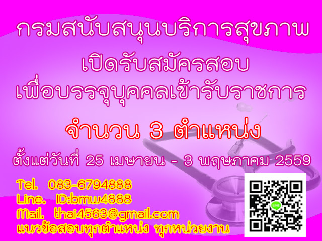กรมสนับสนุนบริการสุขภาพเปิดสมัครสอบเข้ารับราชการ 3 อัตรา กรมสนับสนุนบริการสุขภาพเปิดรับสมัครสอบเพื่อบรรจุบุคคลเข้ารับราชการ จำนวน 3 อัตรา รับสมัครทางอินเทอร์เน็ต ตั้งแต่วันที่ 25 เมษายน - 3 พฤษภาคม 2559 ประกาศกรมสนับสนุนบริการสุขภาพ เรื่อง รับสมัครสอบแข่งขันเพื่อบรรจุและแต่งตั้งบุคคลเข้ารับราชการ.