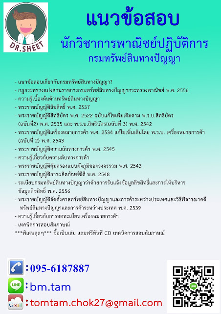แนวข้อสอบนักวิชาการพาณิชย์ปฏิบัติการ กรมทรัพย์สินทางปัญญา- แนวข้อสอบเกี่ยวกับกรมทรัพย์สินทางปัญญา- กฎกระทรวงแบ่งส่วนราชการกรมทรัพย์สินทางปัญญากระทรวงพาณิชย์ พ.ศ. 2556- ความรู้เบื้องต้นด้านทรัพย์สินทางปัญญา- พระราชบัญญัติลิขสิทธิ์ พ.ศ. 2537- พระราชบัญญัติสิทธิบัตร พ.ศ. 2522 ฉบับแก้ไขเพิ่มเติมตาม พ.ร.บ.สิทธิบัตร (ฉบับที่2) พ.ศ. 2535 และ พ.ร.บ.สิทธิบัตร(ฉบับที่ 3) พ.ศ. 2542- พระราชบัญญัติเครื่องหมายการค้า พ.ศ. 2534 แก้ไขเพิ่มเติมโดย พ.ร.บ. เครื่องหมายการค้า (ฉบับที่ 2) พ.ศ. 2543- พระราชบัญญัติความลับทางการค้า พ.ศ. 2545- ความรู้เกี่ยวกับความลับทางการค้า- พระราชบัญญัติคุ้มครองแบบผังภูมิของวงจรรวม พ.ศ. 2543- พระราชบัญญัติการผลิตภัณฑ์ซีดี พ.ศ. 2548- ระเบียบกรมทรัพย์สินทางปัญญาว่าด้วยการรับแจ้งข้อมูลลิขสิทธิ์และการให้บริหาร ข้อมูลลิขสิทธิ์ พ.ศ. 2556- พระราชบัญญัติจัดตั้งศาลทรัพย์สินทางปัญญาและการค้าระหว่างประเทศและวิธีพิจารณาคดี ทรัพย์สินทางปัญญาและการค้าระหว่างประเทศ พ.ศ. 2539- ความรู้เกี่ยวกับการจดทะเบียนเครื่องหมายการค้า- เทคนิคการสอบสัมภาษณ์***พิเศษสุดๆ*** ชื้อเป็นเล่ม แถมฟรีทันที CD เทคนิคการสอบสัมภาษณ์ รายละเอียดภายในไฟล์ประกอบด้วย- อัพเดทแนวข้อสอบทุกวิชาที่ใช้สอบของแต่ละหน่วยงาน ล่าสุด