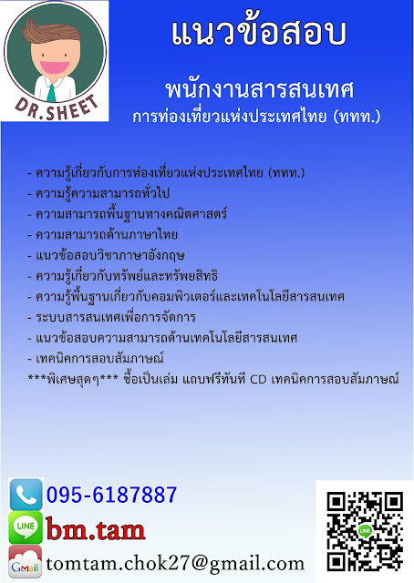 แนวข้อสอบพนักงานสารสนเทศ การท่องเที่ยวแห่งประเทศไทย (ททท.) - ความรู้เกี่ยวกับการท่องเที่ยวแห่งประเทศไทย (ททท.)- ความรู้ความสามารถทั่วไป- ความสามารถพื้นฐานทางคณิตศาสตร์- ความสามารถด้านภาษาไทย- แนวข้อสอบวิชาภาษาอังกฤษ- ความรู้เกี่ยวกับทรัพย์และทรัพยสิทธิ- ความรู้พื้นฐานเกี่ยวกับคอมพิวเตอร์และเทคโนโลยีสารสนเทศ- ระบบสารสนเทศเพื่อการจัดการ- แนวข้อสอบความสามารถด้านเทคโนโลยีสารสนเทศ - เทคนิคการสอบสัมภาษณ์***พิเศษสุดๆ*** ชื้อเป็นเล่ม แถบฟรีทันที CD เทคนิคการสอบสัมภาษณ์ รายละเอียดภายในไฟล์ประกอบด้วย- อัพเดทแนวข้อสอบทุกวิชาที่ใช้สอบของแต่ละหน่วยงาน ล่าสุด