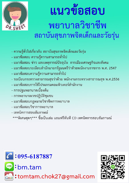 - ความรู้ทั่วไปเกี่ยวกับ สถาบันสุขภาพจิตเด็กและวัยรุ่น- แนวข้อสอบ ความรู้ความสามารถทั่วไป- แนวข้อสอบ ข่าว และเหตุการณ์ปัจจุบัน การเมืองเศรษฐกิจและสังคม- แนวข้อสอบระเบียบสำนักนายกรัฐมนตรีว่าด้วยพนักงานราชการ พ.ศ. 2547- แนวข้อสอบความรู้ความสามารถทั่วไป- ระเบียบกระทรวงสาธารณสุขว่าด้วย พนักงานกระทรวงสาธารณสุข พ.ศ.2556- แนวข้อสอบการใช้โปรแกรมคอมพิวเตอร์สำนักงาน- การปฐมพยาบาลเบื้องต้น- การพยาบาลเวชปฏิบัติชุมชน- แนวข้อสอบกฎหมายวิชาชีพการพยาบาล- แนวข้อสอบวิชาการพยาบาล- เทคนิคการสอบสัมภาษณ์ ***พิเศษสุดๆ*** ชื้อเป็นเล่ม แถมฟรีทันที CD เทคนิคการสอบสัมภาษณ์ รายละเอียดภายในไฟล์ประกอบด้วย- อัพเดทแนวข้อสอบทุกวิชาที่ใช้สอบของแต่ละหน่วยงาน ล่าสุด