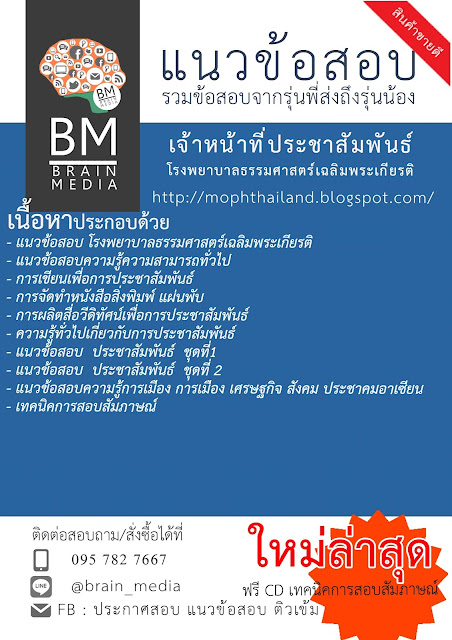 เนื้อหาประกอบด้วย- แนวข้อสอบ โรงพยาบาลธรรมศาสตร์เฉลิมพระเกียรติ- แนวข้อสอบความรู้ความสามารถทั่วไป-การเขียนเพื่อการประชาสัมพันธ์-การจัดทำหนังสือสิ่งพิมพ์ แผ่นพับ-การผลิตสื่อวีดิทัศน์เพื่อการประชาสัมพันธ์-ความรู้ทั่วไปเกี่ยวกับการประชาสัมพันธ์-แนวข้อสอบ ประชาสัมพันธ์ ชุดที่1-แนวข้อสอบ ประชาสัมพันธ์ ชุดที่ 2-แนวข้อสอบความรู้การเมือง การเมือง เศรษฐกิจ สังคม ประชาคมอาเซียน- เทคนิคการสอบสัมภาษณ์รายละเอียดเพิ่มเติมที่ http://mophthailand.blogspot.com/[/b]