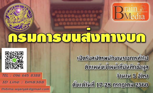 กรมการขนส่งทางบก รับสมัครบุคคลเพื่อสอบบรรจุเข้ารับราชการ ตำแหน่ง นักประชาสัมพันธ์ปฏิบัติการและตำแหน่ง นายช่างไฟฟ้าปฏิบัติงาน ตั้งแต่วันที่ 3-27 กรกฎาคม พ.ศ. 2560ตำแหน่ง นักประชาสัมพันธ์ปฏิบัติการเงินเดือน 15000 บาท