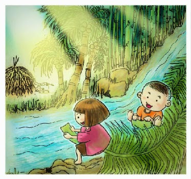 น้ำใสไหลเย็นผ่านกอหญ้า สองฝั่งของคูน้ำค่อนข้างรก มีทางมะพร้าวแห้งตกลงมากองขวางทางไหลของน้ำ ลดความเร็วในการไหลของน้ำลง สองพี่น้องช่วยกันดึงทางมะพร้าวออก เพื่อจะเอาเรือกระดาษที่ช่วยกันพับปล่อยลงไปลอยเล่น การพับเรือกระดาษทำได้ไม่ยาก จึงพับได้เร็ว จากนั้นก็เอามาแข่งกัน เรือสมมุติลอยไปตามสายน้ำ เด็กๆพากันวิ่งตาม เรือกระดาษลอยไปไม่เท่าไหร่ก็มักล่มเพราะความเร็วแรงของน้ำ แต่มันก็ยังถูกพัดพาจนไปลอยนิ่งอยู่ตรงแอ่งทราย ค่อยๆไหลเอื่อยๆเพื่อเดินทางไปถึงอีกสุดปลายของสายน้ำ