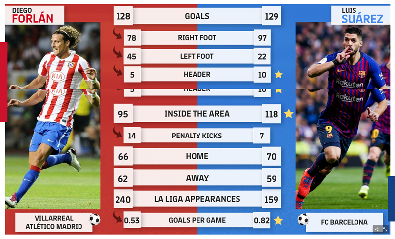 โดยที่ซัวเรซทำได้โดยการยิงจากจุดโทษน้อยกว่าฟอร์ลัน 7 ต่อ 14 ครั้ง และยังลงเล่นน้อยกว่า 159 ต่อ 240 ครั้ง