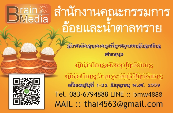 สำนักงานคณะกรรมการอ้อยและน้ำตาลทรายรับสมัครบุคคลเพื่อสอบเข้ารับราชการ ตำแหน่ง นักวิชาการพัสดุปฏิบัติการ นักวิชาการเงินและบัญชีปฏิบัติการ ตั้งแต่วันที่ 1-22 มิถุนายน พ.ศ. 2559