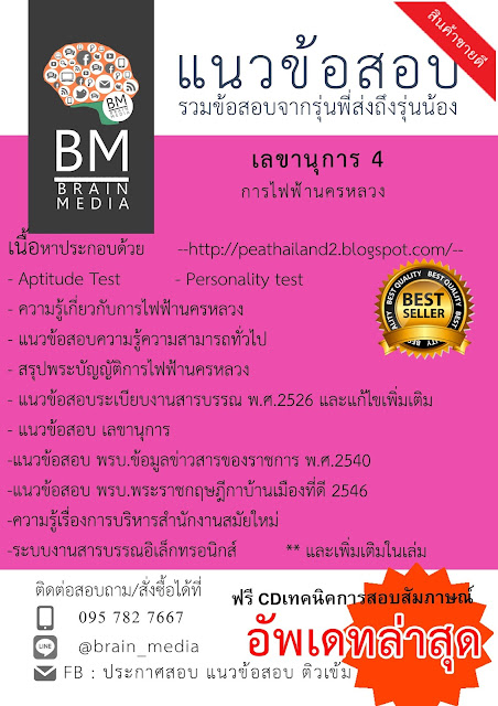 แนวข้อสอบเลขานุการ 4 การไฟฟ้านครหลวง เนื้อหาประกอบด้วย- Aptitude Test- Personality test- ความรู้เกี่ยวกับการไฟฟ้านครหลวง- แนวข้อสอบความรู้ความสามารถทั่วไป[/b]