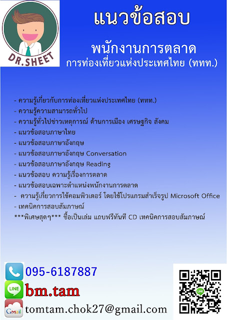 แนวข้อสอบพนักงานการตลาด การท่องเที่ยวแห่งประเทศไทย (ททท.) - ความรู้เกี่ยวกับการท่องเที่ยวแห่งประเทศไทย (ททท.)- ความรู้ความสามารถทั่วไป- ความรู้ทั่วไปข่าวเหตุการณ์ ด้านการเมือง เศรษฐกิจ สังคม- แนวข้อสอบภาษาไทย- แนวข้อสอบภาษาอังกฤษ- แนวข้อสอบภาษาอังกฤษ Conversation- แนวข้อสอบภาษาอังกฤษ Reading- แนวข้อสอบ ความรู้เรื่องการตลาด- แนวข้อสอบเฉพาะตำแหน่งพนักงานการตลาด- ความรู้เกี่ยวการใช้คอมพิวเตอร์ โดยใช้โปรแกรมสำเร็จรูป Microsoft Office - เทคนิคการสอบสัมภาษณ์***พิเศษสุดๆ*** ชื้อเป็นเล่ม แถบฟรีทันที CD เทคนิคการสอบสัมภาษณ์ รายละเอียดภายในไฟล์ประกอบด้วย- อัพเดทแนวข้อสอบทุกวิชาที่ใช้สอบของแต่ละหน่วยงาน ล่าสุด