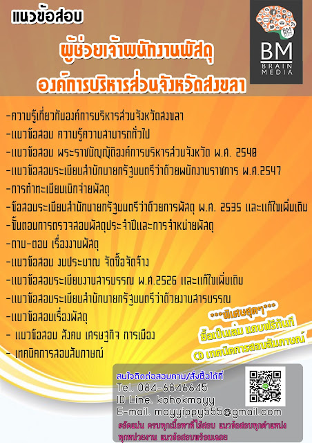 - ความรู้เกี่ยวกับองค์การบริหารส่วนจังหวัดสงขลา- แนวข้อสอบ ความรู้ความสามารถทั่วไป- แนวข้อสอบ พระราชบัญญัติองค์การบริหารส่วนจังหวัด พ.ศ. 2540- แนวข้อสอบระเบียบสำนักนายกรัฐมนตรีว่าด้วยพนักงานราชการ พ.ศ.2547- การทำทะเบียนเบิกจ่ายพัสดุ-ข้อสอบระเบียบสำนักนายกรัฐมนตรีว่าด้วยการพัสดุ พ.ศ. 2535 และแก้ไขเพิ่มเติม-ขั้นตอนการตรวจสอบพัสดุประจำปีและการจำหน่ายพัสดุ-ถาม-ตอบ เรื่องงานพัสดุ-แนวข้อสอบ งบประมาณ จัดซื้อจัดจ้าง-แนวข้อสอบระเบียบงานสารบรรณ พ.ศ.2526 และแก้ไขเพิ่มเติม-แนวข้อสอบระเบียบสำนักนายกรัฐมนตรีว่าด้วยงานสารบรรณ-แนวข้อสอบเรื่องพัสดุ- แนวข้อสอบ สังคม เศรษฐกิจ การเมือง- เทคนิคการสอบสัมภาษณ์ ***********************************************พิเศษสุดๆ*** ชื้อเป็นเล่ม แถมฟรีทันที CD เทคนิคการสอบสัมภาษณ์