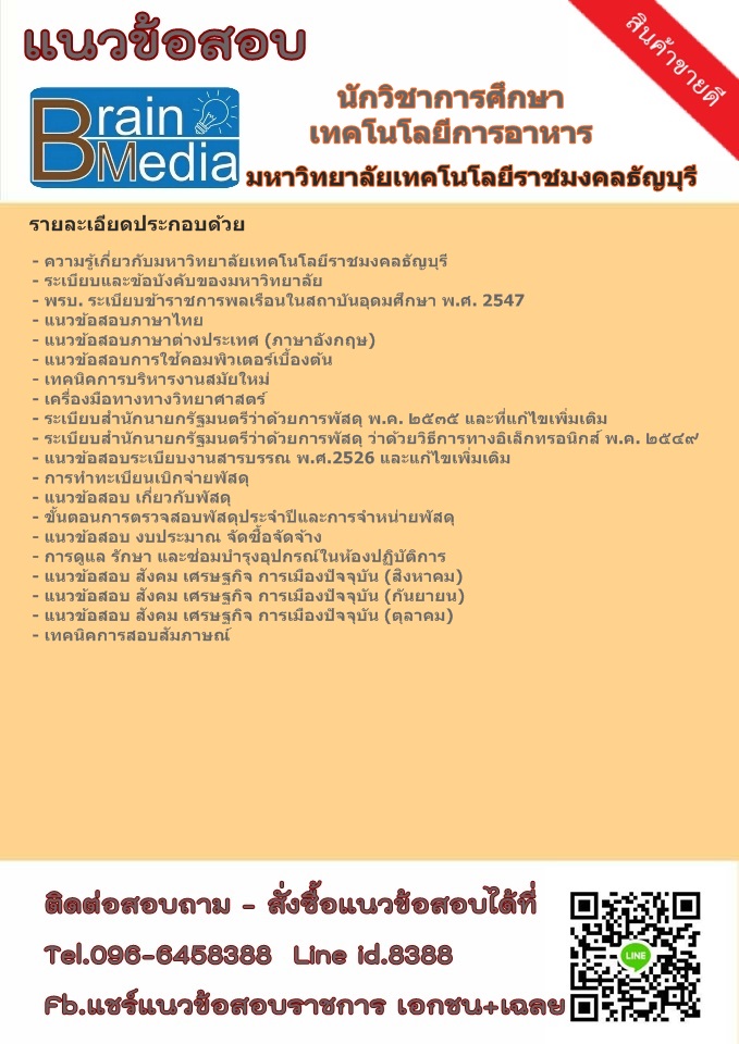 โหลดแนวข้อสอบ นักวิชาการศึกษา (ด้านห้องปฏิบัติการ) วุฒิ : ปริญญาตรี สาขาทางด้านวิทยาศาสตร์และเทคโนโลยีการอาหาร หรือ วิศวกรรมแปรรูปผลิตผลเกษตร หรือ เทคโนโลยีหลังการเก็บเกี่ยวและแปรสภาพ หรือ วิทยาศาสตร์บัณฑิตทางชีวภาพ มหาวิทยาลัยเทคโนโลยีราชมงคลธัญบุรี