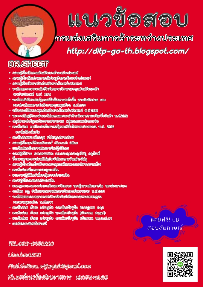 - ความรู้เกี่ยวกับกรมส่งเสริมการค้าระหว่างประเทศ- ความรู้เกี่ยวกับสถานการณ์เศรษฐกิจการค้าระหว่างประเทศ- ความรู้เกี่ยวกับภารกิจส่งเสริมการค้าระหว่างประเทศ- ระเบียบกระทรวงพาณิชย์ว่าด้วยการบริหารกองทุนส่งเสริมการค้าระหว่างประเทศ พ.ศ. 2541- ระเบียบสำนักนายกรัฐมนตรีว่าด้วยการขอจัดตั้ง การดำเนินงาน และการประเมินผลการดำเนินงานทุนหมุนเวียน พ.ศ.2557- หลักเกณฑ์เงินกองทุนส่งเสริมการค้าระหว่างประเทศ พ.ศ.2555- พระราชบัญญัติการส่งออกไปนอกและการนำเข้ามาในราชอาณาจักรซึ่งสินค้า พ.ศ.2522- สรุปสาระสำคัญระเบียบงานสารบรรณ (สูตรและเทคนิคการจำ)- แนวข้อสอบ ระเบียบสำนักนายกรัฐมนตรีว่าด้วยงานสารบรรณ พ.ศ. 2526 และที่แก้ไขเพิ่มเติม- แนวข้อสอบภาษาอังกฤษ (พิชิตทุกสนามสอบ)- ความรู้เกี่ยวการใช้คอมพิวเตอร์ Microsoft Office- เเนวข้อสอบนักตรวจสอบภายในปฏิบัติการ- การปฏิบัติงาน การตรวจสอบ และควบคุมควบคุมวัสดุ ครุภัณฑ์- ขั้นตอนการตรวจสอบพัสดุประจำปีและการจำหน่ายพัสดุ- ความรู้เบื้องต้นเกี่ยวกับการควบคุมภายในและการบริหารความเสี่ยง- แนวข้อสอบเรื่องการควบคุมภายใน- แนวทางปฏิบัติหน้าที่ของผู้ตรวจสอบภายใน- แนวปฏิบัติการตรวจสอบภายใน- มาตรฐานการตรวจสอบภายในและจริยธรรม ของผู้ตรวจสอบภายใน ของส่วนราชการ- ระเบียบ กฎ ว่าด้วยการตรวจสอบภายในของส่วนราชการ พ.ศ.2551- ระเบียบคณะกรรมการตรวจเงินแผ่นดินว่าด้วยการกำหนดมาตรฐานการควบคุมภายใน พ.ศ.2544- แนวข้อสอบ สังคม เศรษฐกิจ การเมืองปัจจุบัน (กรกฎาคม July)- แนวข้อสอบ สังคม เศรษฐกิจ การเมืองปัจจุบัน (สิงหาคม August)- แนวข้อสอบ สังคม เศรษฐกิจ การเมืองปัจจุบัน (กันยายน September)