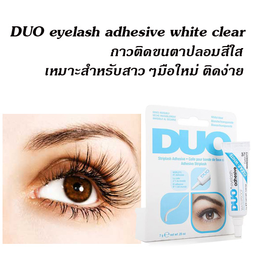กาวติดขนตาปลอม DUO สำหรับสี white clear เวลาบีบออกมาจากหลอดจะเป็นสีขาวและเวลาแห้งจะกลายเป็นสีใส จะเหมาะกับคนที่อาจจะยังไม่ชำนาญในการติดขนตาปลอม เพราะถึงแม้เวลาติดอาจจะมีกาวเลอะบนเปลือกตาบ้างจากที่เราแกะขนตาปลอมออกและติดใหม่เวลาเราติดไม่ตรงก็จะไม่เป็นปัญหาอะไรเพราะตอนแห้งกาวจะกลายเป็นสีใส ไม่ดูเลอะเทอะ
