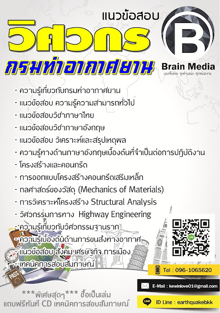 [/url] - ความรู้เกี่ยวกับกรมท่าอากาศยาน- แนวข้อสอบ ความรู้ความสามารถทั่วไป - แนวข้อสอบวิชาภาษาไทย- แนวข้อสอบวิชาภาษาอังกฤษ- แนวข้อสอบ วิเคราะห์และสรุปเหตุผล- ความรู้ทางด้านภาษาอังกฤษเบื้องต้นที่จำเป็นต่อการปฏิบัติงาน- โครงสร้างและคอนกรีต- การออกแบบโครงสร้างคอนกรีตเสริมเหล็ก- กลศาสตร์ของวัสดุ (Mechanics of Materials)- การวิเคราะห์โครงสร้าง Structural Analysis- วิศวกรรมการทาง Highway Engineering- ความรู้เกี่ยวกับวิศวกรรมฐานราก- ความรู้เบื้องต้นด้านการขนส่งทางอากาศ - แนวข้อสอบ สังคม เศรษฐกิจ การเมือง- เทคนิคการสอบสัมภาษณ์***พิเศษสุดๆ*** ชื้อเป็นเล่ม แถบฟรีทันที CD เทคนิคการสอบสัมภาษณ์[/b]