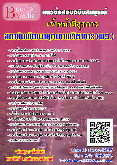 - ความรู้เกี่ยวกับสถาบันพัฒนาคุณภาพวิชาการ (พว.)- แนวข้อสอบ ความรู้ความสามารถทั่วไป- แนวข้อสอบระเบียบสำนักนายกรัฐมนตรีว่าด้วยพนักงานราชการ พ.ศ.2547- เเนวข้อสอบพระราชบัญญัติระเบียบข้าราชการพลเรือน พ.ศ.2551- แนวข้อสอบ พรบ.ข้อมูลข่าวสารของราชการ พ.ศ.2540- แนวข้อสอบ พรบ.พระราชกฤษฎีกาบ้านเมืองที่ดี 2546- แนวข้อสอบระเบียบงานสารบรรณ พ.ศ.2526 และแก้ไขเพิ่มเติม- ระเบียบสำนักนายกรัฐมนตรีว่าด้วยการพัสดุ พ.ศ. ๒๕๓๕ และที่แก้ไขเพิ่มเติม- ระเบียบสำนักนายกรัฐมนตรีว่าด้วยการพัสดุด้วยวิธีการทางอิเล็กทรอนิกส์ พ.ศ. ๒๕๔๙- ความรู้เกี่ยวกับระบบการจัดซื้อจัดจ้างภาครัฐด้วยระบบอิเล็กทรอนิกส์ (e-GP)- การทำทะเบียนเบิกจ่ายพัสดุ- แนวข้อสอบเกี่ยวกับงานธุรการ- หน้าที่และความรับผิดชอบงานธุรการ- การใช้คอมพิวเตอร์โปรแกรม Microsoft Office- แนวข้อสอบ สังคม เศรษฐกิจ การเมืองปัจจุบัน (กันยายน)- แนวข้อสอบ สังคม เศรษฐกิจ การเมืองปัจจุบัน (ตุลาคม)- แนวข้อสอบ สังคม เศรษฐกิจ การเมืองปัจจุบัน (พฤศจิกายน)- เทคนิคการสอบสัมภาษณ์ ***พิเศษสุดๆ*** ชื้อเป็นเล่ม แถมฟรีทันที CD เทคนิคการสอบสัมภาษณ์[/b]