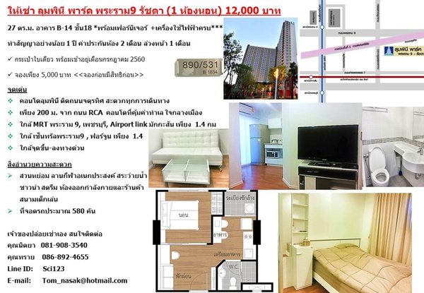 ผู้เขียน หัวข้อ: ให้เช่า ลุมพินี พาร์ค พระราม9 รัชดา (1 ห้องนอน) 12,000 บาท 26 ตร.ม.  (อ่าน 43 ครั้ง)