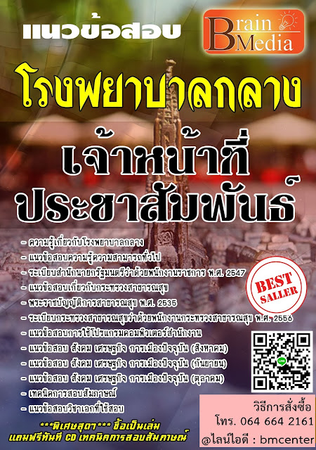 “รูปแบบของหนังสือเตรียมสอบ เป็นข้อสอบพร้อมเฉลยละเอียด ที่มาจากสนามจริง รวบรวมโดยทีมงานนักวิชาการ ที่มีความรู้ ความสามารถ และได้รับการแนะนำบอกต่อจากผู้ผ่านสนามสอบ ไว้ใจแนวข้อสอบของเรา Brain Media Center ศูนย์รวมแนวข้อสอบ อันดับต้นๆ ของเมืองไทย “เพื่ออนาคตของคุณ” ขอบคุณครับ”Tags : โรงพยาบาลกลาง,เจ้าหน้าที่ประชาสัมพันธ์ ,โรงพยาบาลกลาง