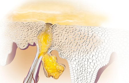 เมื่อต่อมไขมัน สร้างน้ำมันออกมาในปริมาณมาก ประกอบกับการที่ผิวหนังชั้นนอกสุด(Stratum corneum) เกิดการหนาตัวขึ้นผิดปกติ จึงทำให้เกิดการอุดตันขึ้นในรูขุมขน ซึ่งกลายเป็นสิวอุดตันหัวปิด (สิวหัวขาว) หรือ ถ้าการอุดตันเกิดขึ้นใกล้กับปากรูขุมขน ก็จะเกิดเป็นสิวหัวเปิด (สิวหัวดำ) ขึ้นมา