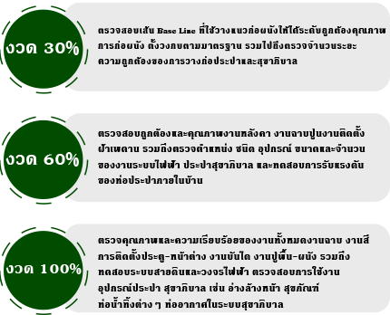 ระหว่างการก่อสร้างบ้าน พีวัน คอนสตรัชั่น จะมีฝ่ายบริหารประสิทธิภาพงาน ก่อสร้าง เข้าไปตรวจทานและก็ประเมินประสิทธิภาพบ้านเป็นระยะๆตามงวดงาน ดังนี้