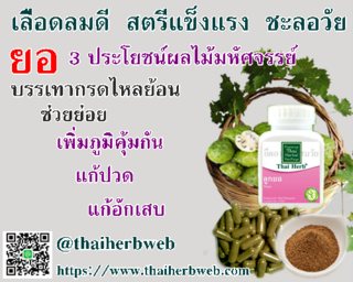 ยอ…สมุนไพรของการแพทย์ไทยยอ เป็นสมุนไพรอายุวัฒนะของสังคมไทย เพราะนอกจากจะมีคุณค่าทางอาหารสูงทั้งในใบและผลแล้ว ยอยังช่วยย่อย บำรุงธาตุไฟ แก้ท้องอืด ท้องเฟ้อ อันเป็นปัจจัยแรกที่จะทำให้ร่างกายเป็นปกติ ไม่เสียสมดุล คนสมัยก่อนจะกินยอเพื่อแก้ท้องอืดอาหารไม่ย่อย เพราะยอเป็นยาร้อน ซึ่งความเป็นยาร้อนก็จะช่วยเพิ่มพลังของธาตุไฟที่ช่วยในการเคลื่อนไหว และการไหลเวียนต่างๆ ให้แก่ร่างกาย รับประทานมากจะทำให้ธาตุไฟเผาผลาญซึ่งทำให้ร่างกายผ่ายผอมลงได้