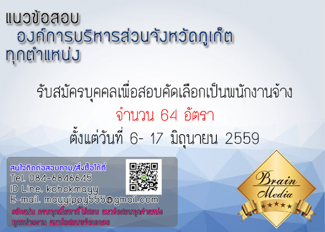 องค์การบริหารส่วนจังหวัดภูเก็ต ( Phuket Provincial Administrative Organization) รับสมัครบุคคลเพื่อสอบคัดเลือกเป็นพนักงานจ้าง จำนวน 64 อัตรา วุฒิ ปวช.- ปวท.-ปวส.- ปริญญาตรี – ไม่จำกัดวุฒิ สมัครได้ด้วยตนเอง ตั้งแต่วันที่ 6- 17 มิถุนายน 2559 ในวันและเวลาราชการ[/b]