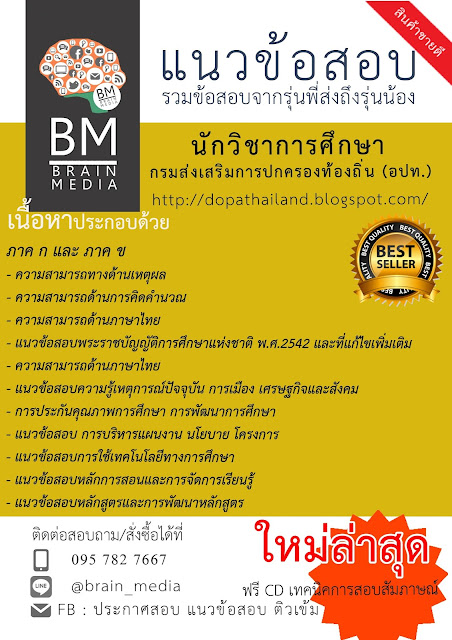 แนวข้อสอบ นักวิชาการศึกษา กรมส่งเสริมการปกครองท้องถิ่น (อปท.) ภาค ก- ความรู้เกี่ยวกับกรมส่งเสริมการปกครองท้องถิ่น- แนวข้อสอบความสามารถในการศึกษา วิเคราะห์และสรุปเหตุผล- แนวข้อสอบความสามารถในการใช้ภาษาไทย- แนวข้อสอบพระราชบัญญัติระเบียบบริหารราชการแผ่นดิน- แนวข้อสอบพระราชบัญญัติเทศบาล- แนวข้อสอบพระราชบัญญัติองค์การบริหารส่วนจังหวัด- แนวข้อสอบพระราชบัญญัติสภาตำบลและองค์การบริหารส่วนตำบล- แนวข้อสอบพระราชบัญญัติระเบียบบริหารราชการ.- แนวข้อสอบพระราชบัญญัติกำหนดแผนและขั้นตอนการกระจายอำนาจให้แก่องค์กรปกครองส่วนท้องถิ่น- แนวข้อสอบพระราชบัญญัติระเบียบบริหารงานบุคคลส่วนท้องถิ่น- แนวข้อสอบพระราชกฤษฎีกาว่าด้วยหลักเกณฑ์และวิธีการการบริหารกิจการบ้านเมืองที่ดีแนวข้อสอบระเบียบสำนักนายกรัฐมนตรีว่าด้วยงานสารบรรณ- แนวข้อสอบเก่า ภาค ก ท้องถิ่นภาค ข- ความสามารถทางด้านเหตุผล- ความสามารถด้านการคิดคำนวณ- ความสามารถด้านภาษาไทย- แนวข้อสอบพระราชบัญญัติการศึกษาแห่งชาติ พ.ศ.2542 และที่แก้ไขเพิ่มเติม- ความสามารถด้านภาษาไทย- แนวข้อสอบความรู้เหตุการณ์ปัจจุบัน การเมือง เศรษฐกิจและสังคม- การประกันคุณภาพการศึกษา การพัฒนาการศึกษา- แนวข้อสอบ การบริหารแผนงาน นโยบาย โครงการ- แนวข้อสอบการใช้เทคโนโลยีทางการศึกษา- แนวข้อสอบหลักการสอนและการจัดการเรียนรู้- แนวข้อสอบหลักสูตรและการพัฒนาหลักสูตร- เทคนิคการสอบสัมภาษณ์รายละเอียดเพิ่มเติมที่ http://dopathailand.blogspot.com/[/b]