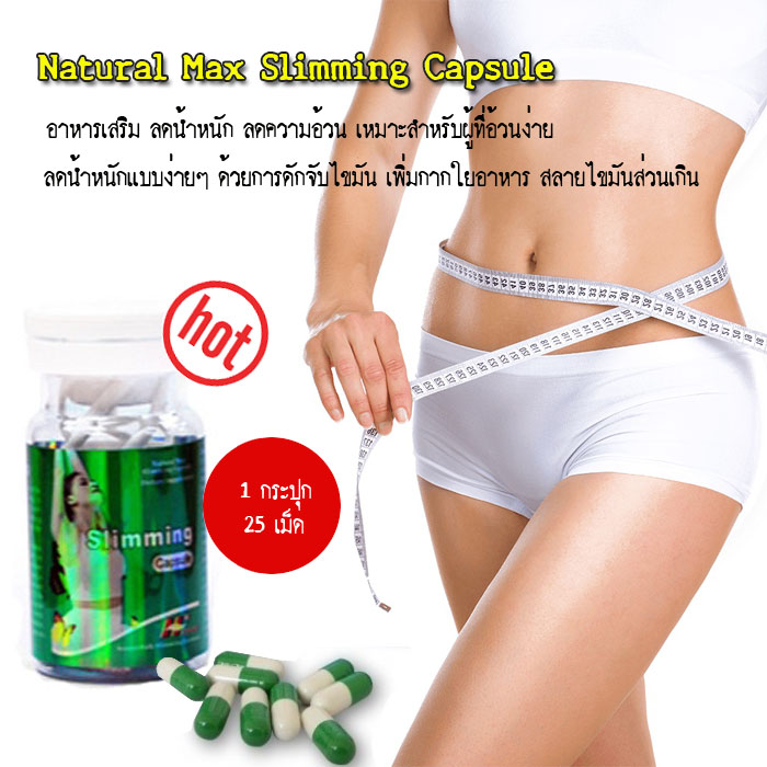 Natural Max Slimming Capsule อาหารเสริม ลดน้ำหนัก ลดความอ้วน มีฤทธิ์ในการทำให้ไขมันไม่ถูกดูดซึม ดักจับไขมันในกระเพาะอาหารและลำไส้ เพิ่มกากใยอาหาร ทำให้อิ่ม ปล่อยน้ำมันออกจากร่างกาย ไม่ให้ไขมันสะสมในร่างกาย ปล่อยขยะและพิษอย่างรวดเร็ว ช่วยในเรื่อง การสลายไขมันส่วนเกินที่มักจะสะสมอยู่ตาม ต้นแขน ขา น่อง หน้าท้อง ใบหน้า และคาง ไม่มีอันตราย ไม่มีฤทธิ์กดประสาท ไม่ใจสั่น