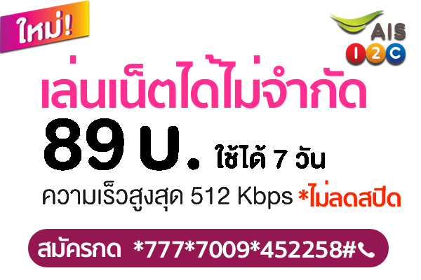 โปรเน็ต AIS 89 บาท เน็ตไม่ลดสปีด ความเร็ว 512Kbps นาน 7 วัน