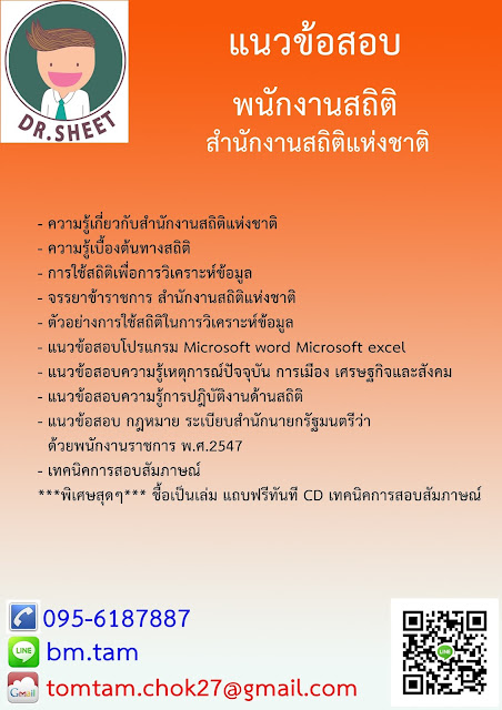 แนวข้อสอบพนักงานสถิติ สำนักงานสถิติแห่งชาติ[/i]- ความรู้เกี่ยวกับสำนักงานสถิติแห่งชาติ- ความรู้เบื้องต้นทางสถิติ- การใช้สถิติเพื่อการวิเคราะห์ข้อมูล- จรรยาข้าราชการ สำนักงานสถิติแห่งชาติ- ตัวอย่างการใช้สถิติในการวิเคราะห์ข้อมูล- แนวข้อสอบโปรแกรม Microsoft word Microsoft excel- แนวข้อสอบความรู้เหตุการณ์ปัจจุบัน การเมือง เศรษฐกิจและสังคม- แนวข้อสอบความรู้การปฎิบัติงานด้านสถิติ- แนวข้อสอบ กฎหมาย ระเบียบสำนักนายกรัฐมนตรีว่า ด้วยพนักงานราชการ พ.ศ.2547- เทคนิคการสอบสัมภาษณ์***พิเศษสุดๆ*** ชื้อเป็นเล่ม แถบฟรีทันที CD เทคนิคการสอบสัมภาษณ์ รายละเอียดภายในไฟล์ประกอบด้วย- อัพเดทแนวข้อสอบทุกวิชาที่ใช้สอบของแต่ละหน่วยงาน ล่าสุด