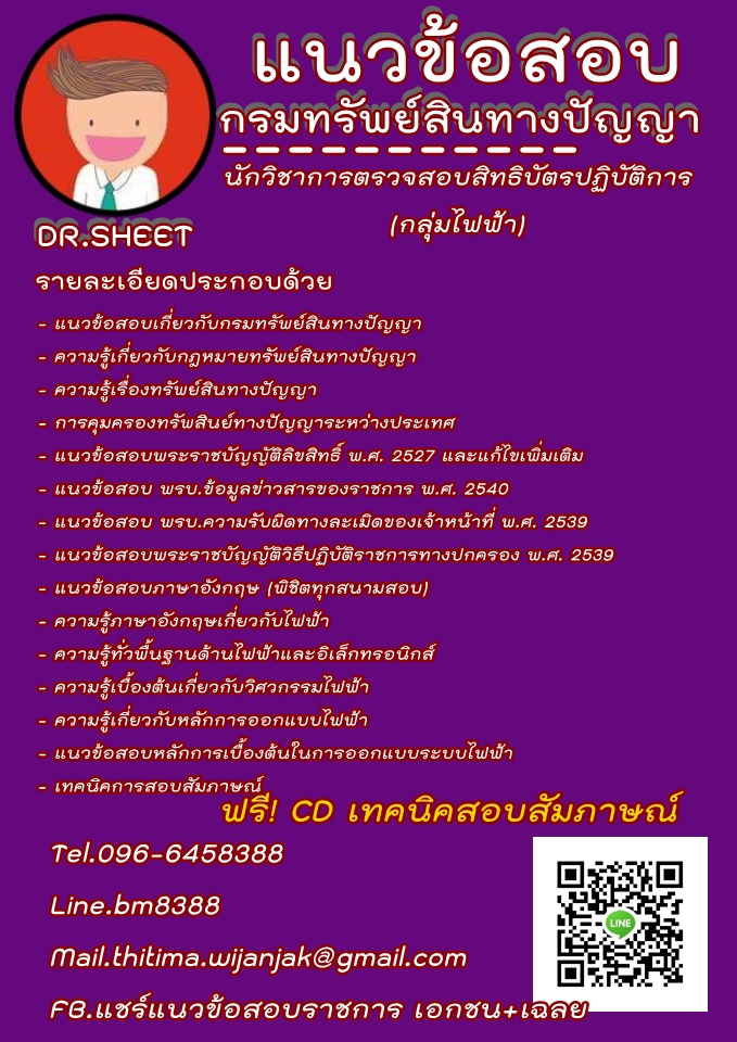 - แนวข้อสอบเกี่ยวกับกรมทรัพย์สินทางปัญญา- ความรู้เกี่ยวกับกฎหมายทรัพย์สินทางปัญญา- ความรู้เรื่องทรัพย์สินทางปัญญา- การคุมครองทรัพสินย์ทางปัญญาระหว่างประเทศ- แนวข้อสอบพระราชบัญญัติลิขสิทธิ์ พ.ศ. 2527 และแก้ไขเพิ่มเติม- แนวข้อสอบ พรบ.ข้อมูลข่าวสารของราชการ พ.ศ. 2540- แนวข้อสอบ พรบ.ความรับผิดทางละเมิดของเจ้าหน้าที่ พ.ศ. 2539- แนวข้อสอบพระราชบัญญัติวิธีปฏิบัติราชการทางปกครอง พ.ศ. 2539- แนวข้อสอบภาษาอังกฤษ (พิชิตทุกสนามสอบ)- ความรู้ภาษาอังกฤษเกี่ยวกับไฟฟ้า- ความรู้ทั่วพื้นฐานด้านไฟฟ้าและอิเล็กทรอนิกส์- ความรู้เบื้องต้นเกี่ยวกับวิศวกรรมไฟฟ้า- ความรู้เกี่ยวกับหลักการออกแบบไฟฟ้า- แนวข้อสอบหลักการเบื้องต้นในการออกแบบระบบไฟฟ้า- เทคนิคการสอบสัมภาษณ์