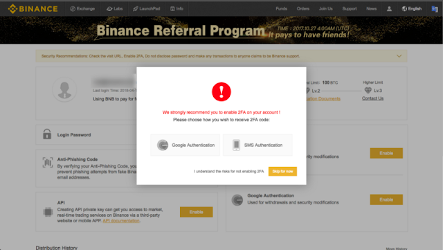 ต่อไป Binance จะแนะนำให้พวกเราเปิดการใช้งาน 2FA ซึ่งเราสามารถเปิด ปิด ได้ตลอดระยะเวลา แม้อยากได้เปิดในงานคราวหลัง สามารถกดที่ปุ่ม Skip for now ได้เลยครับ
