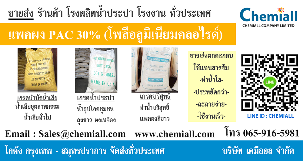 Email : Sales@chemiall.com[/size] โพลีอลูมิเนียมคลอไรด์ แพค เป็นเกลือสังเคราะห์ซึ่งผลิตขึ้นมาสำหรับใช้ในการปรับคุณภาพน้ำ บำบัดน้ำเสียอุตสาหกรรม น้ำดี น้ำบริโภค ทุกชนิด